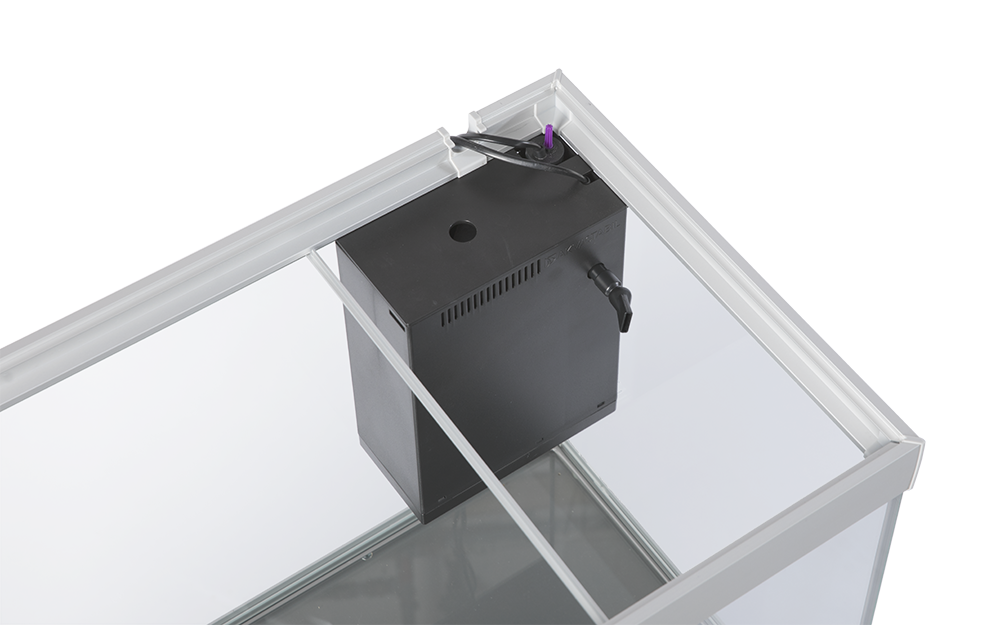 ELEMENT-filteret fastgøres let og effektivt i akvariets topramme. Du kan således helt selv bestemme, hvor du ønsker, det skal placeres; til højre, til venstre eller måske midt i...? Da filteret netop er en alt-i-én løsning, indeholder det både filterkurve med filtermaterialer, et indbygget varmelegeme samt en cirkulationspumpe, som du let kan komme til øverst i filteret – du behøver ikke engang at tage filteret ud af akvariet. Du åbner blot filterets låg, hvorefter du nemt kan trække delene ud og rengøre dem.