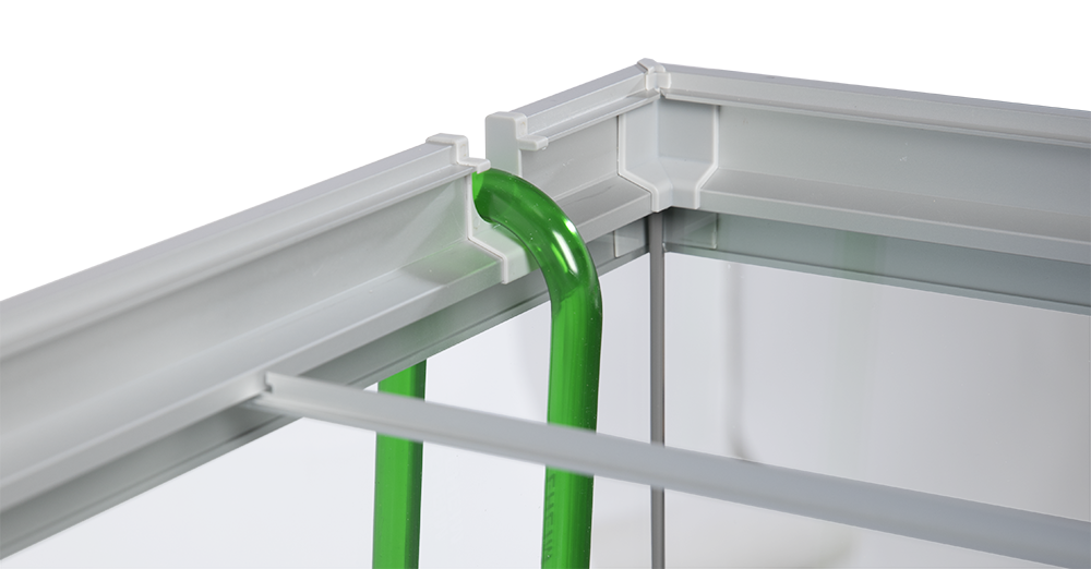 ELEMENT akvariets unikke samlehjørner skjuler profilernes snitkant og giver mulighed for justering når vi monterer rammerne. Hjørnerne kan optage ganske store tolerancer, således at du får markedets bedst tilpassede og tætsiddende rammer.