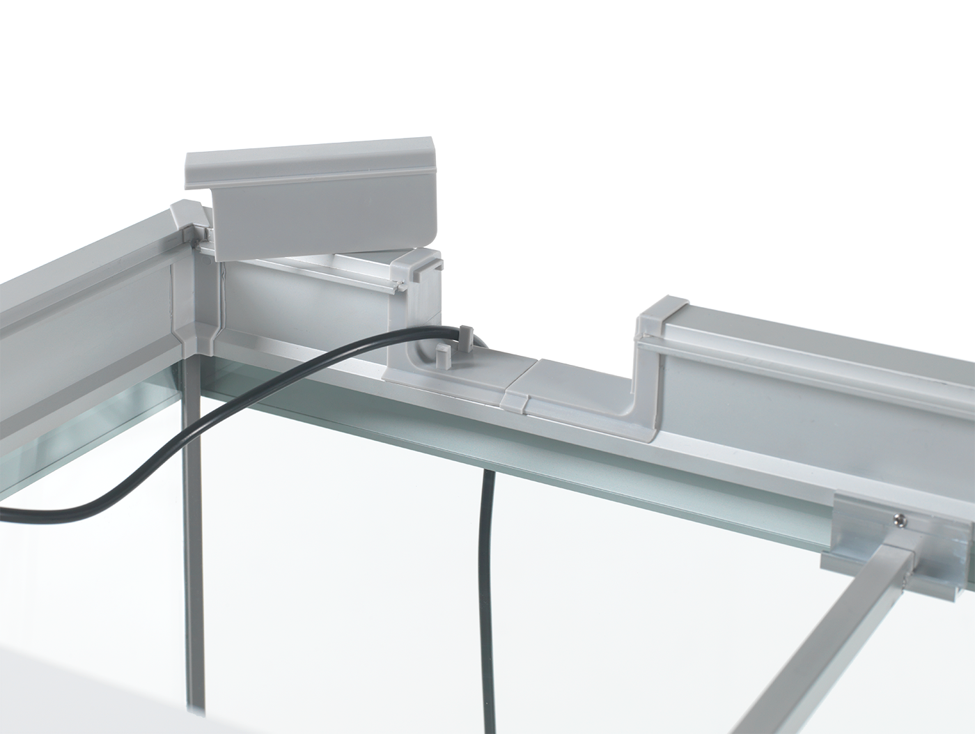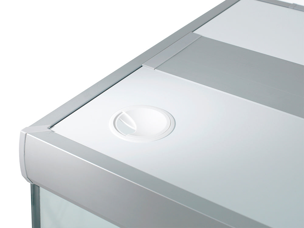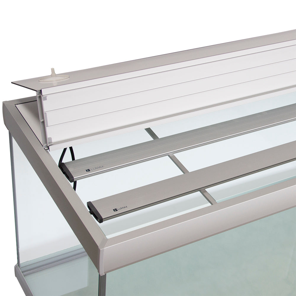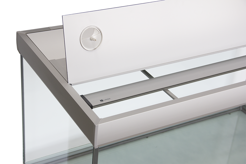 Låget på FUSION består af en solid 12 cm bred aluminiumsprofil med hvide kompositplader på begge sider. På den måde åbner du let låget både for og bag. Hverken aluminiumsprofilen eller pladerne er fastgjort til akvariet, så du nemt kan løfte det helt af, hvis det skulle være nødvendigt. Låget har hverken kanter eller sprækker, som vandet kan ligge på, hvilket gør det let at holde rent og pænt. Åbn låget og skub dine LUMAX LED-lamper bagud, så de ikke er i vejen for dig mens du arbejder nede i akvariet. På den måde har du et perfekt arbejdslys der lyser lige ned i akvariet - lige dér hvor du har brug for det!