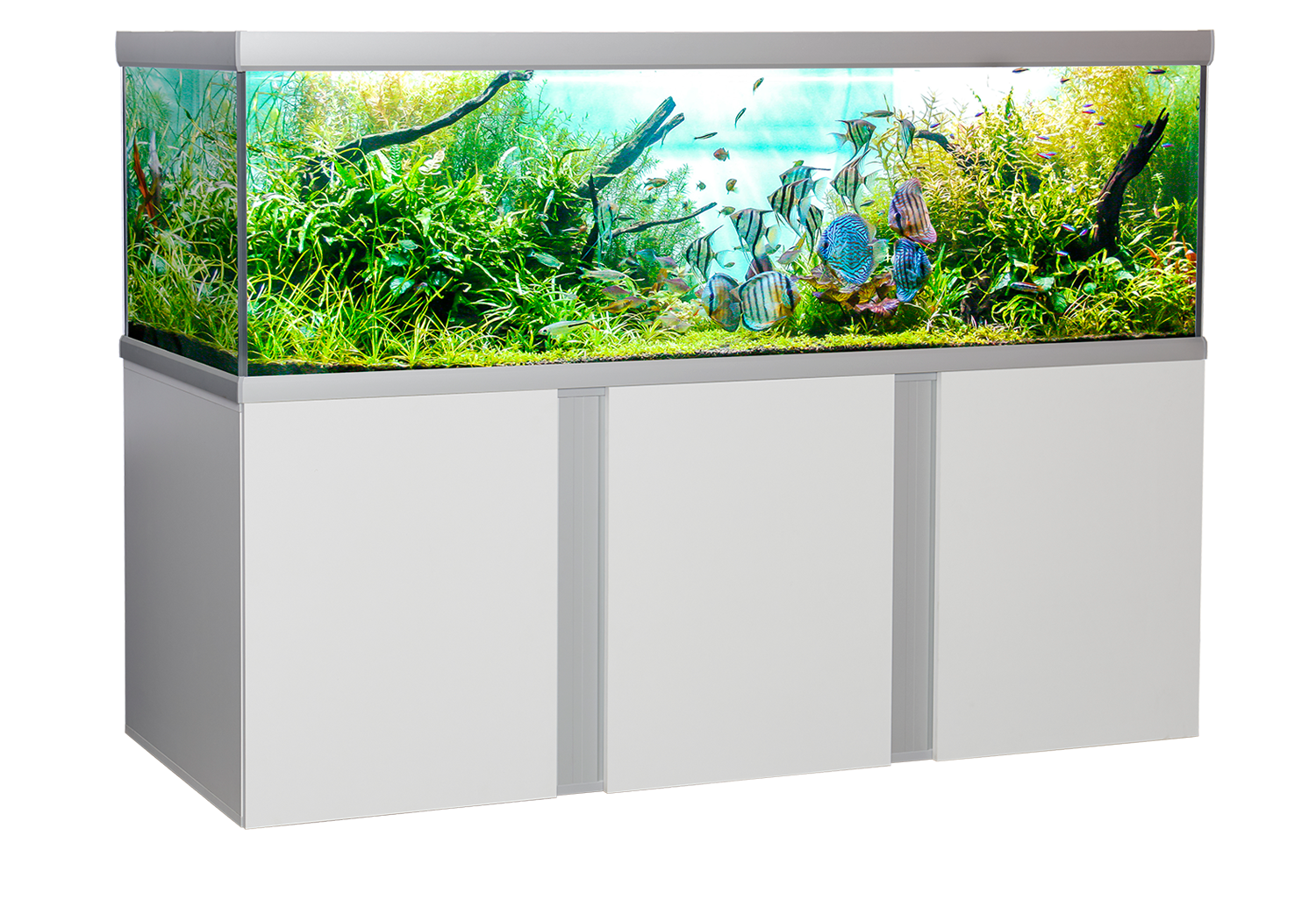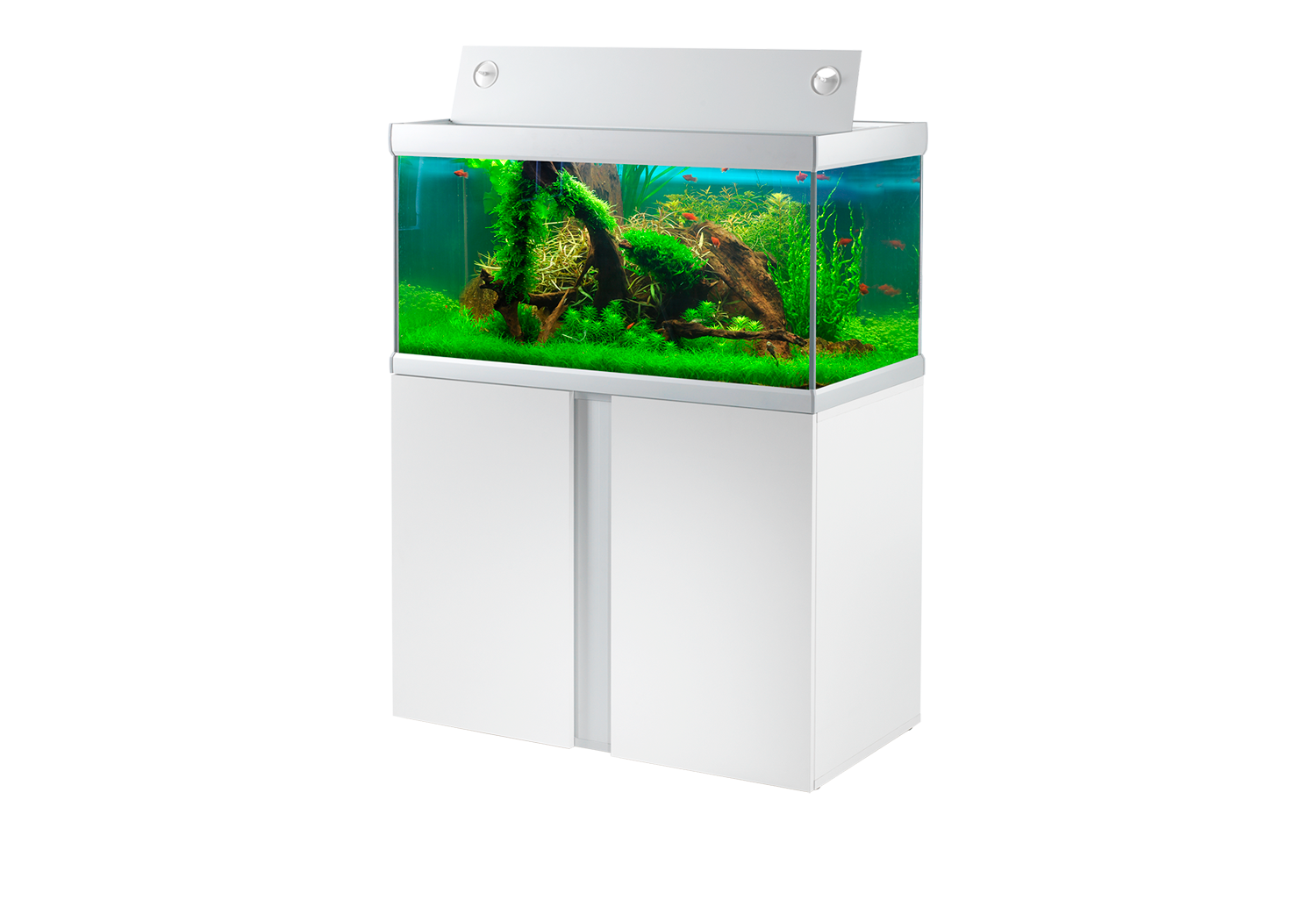 FUSION akvariet leveres med hvide lågplader i en holdbar kompositplade. Aluminiumsprofilerne er naturelokserede, og rammernes grå samlehjørner er en fin designmæssig fortsættelse af glasdelens grå silikonefuger.