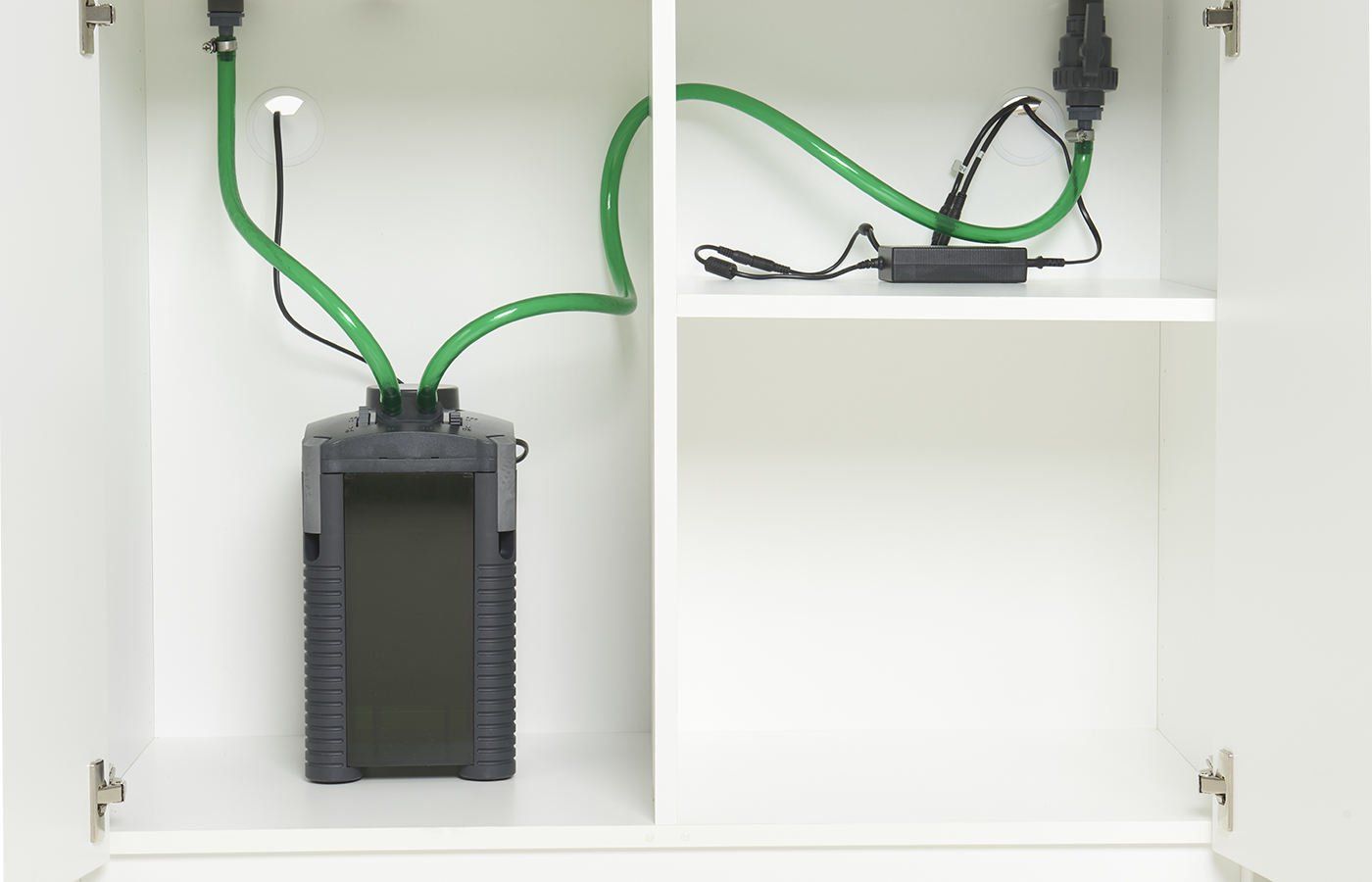Der god plads til selv de største spandpumper bag lågen i MOVE-møblet. Med dele fra vores store tilbehørsserie, tilslutter du let og sikkert filteret direkte op gennem akvariets bundglas.