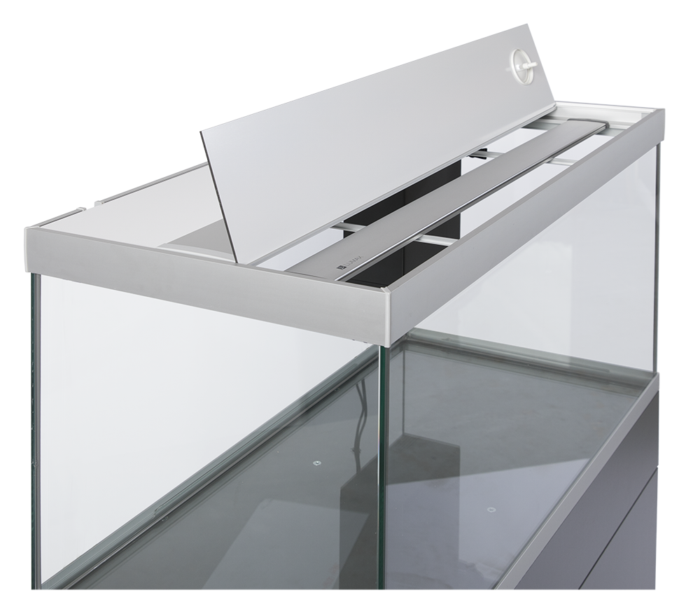 ELEMENT låget er et klassisk 3-delt låg, hvor du blot vipper den forreste del op, når du skal arbejde i akvariet. Har du brug for mere plads, kan du også ”folde” den midterste del med op - eller helt fjerne dem alle. De to yderste lågplader er fremstillet i en alu-plast kompositplade der er både stærk, formstabil og særdeles let at holde ren. Det midterste låg er en kraftig aluminiumsprofil der er lakeret i akvariets farve. Her monterer du også de to medfølgende LED-lysskinner. Lysskinnerne skubbes blot ind fra enden af profilen og er derfor lette at få ud igen ved f.eks. rengøring af låget.