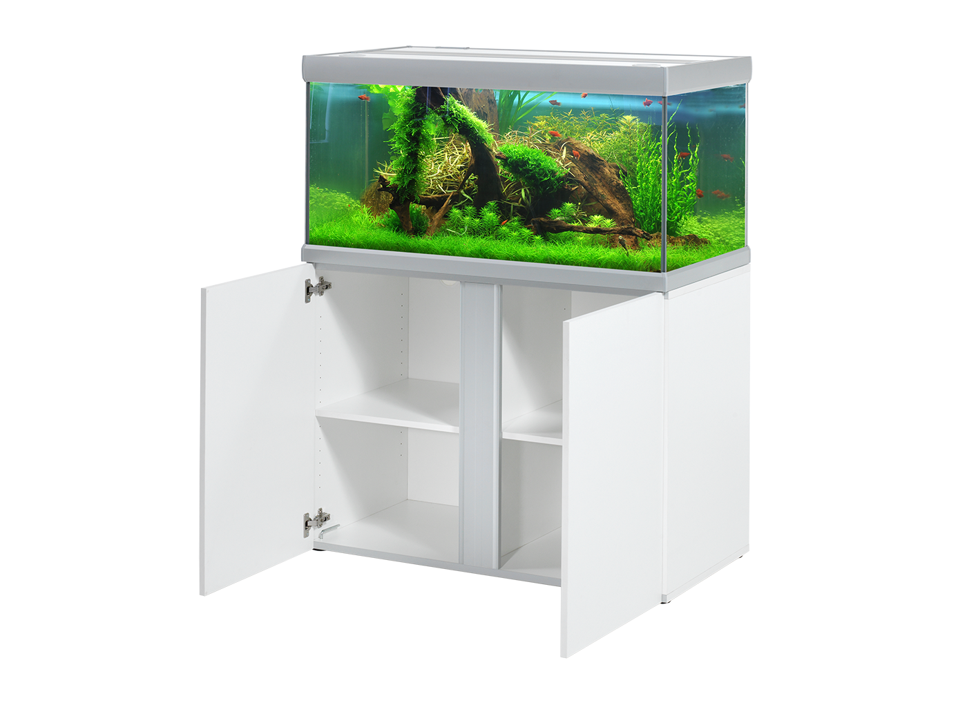 FUSION akvariet leveres med hvide lågplader i en holdbar kompositplade. Aluminiumsprofilerne er naturelokserede, og rammernes grå samlehjørner er en fin designmæssig fortsættelse af glasdelens grå silikonefuger.