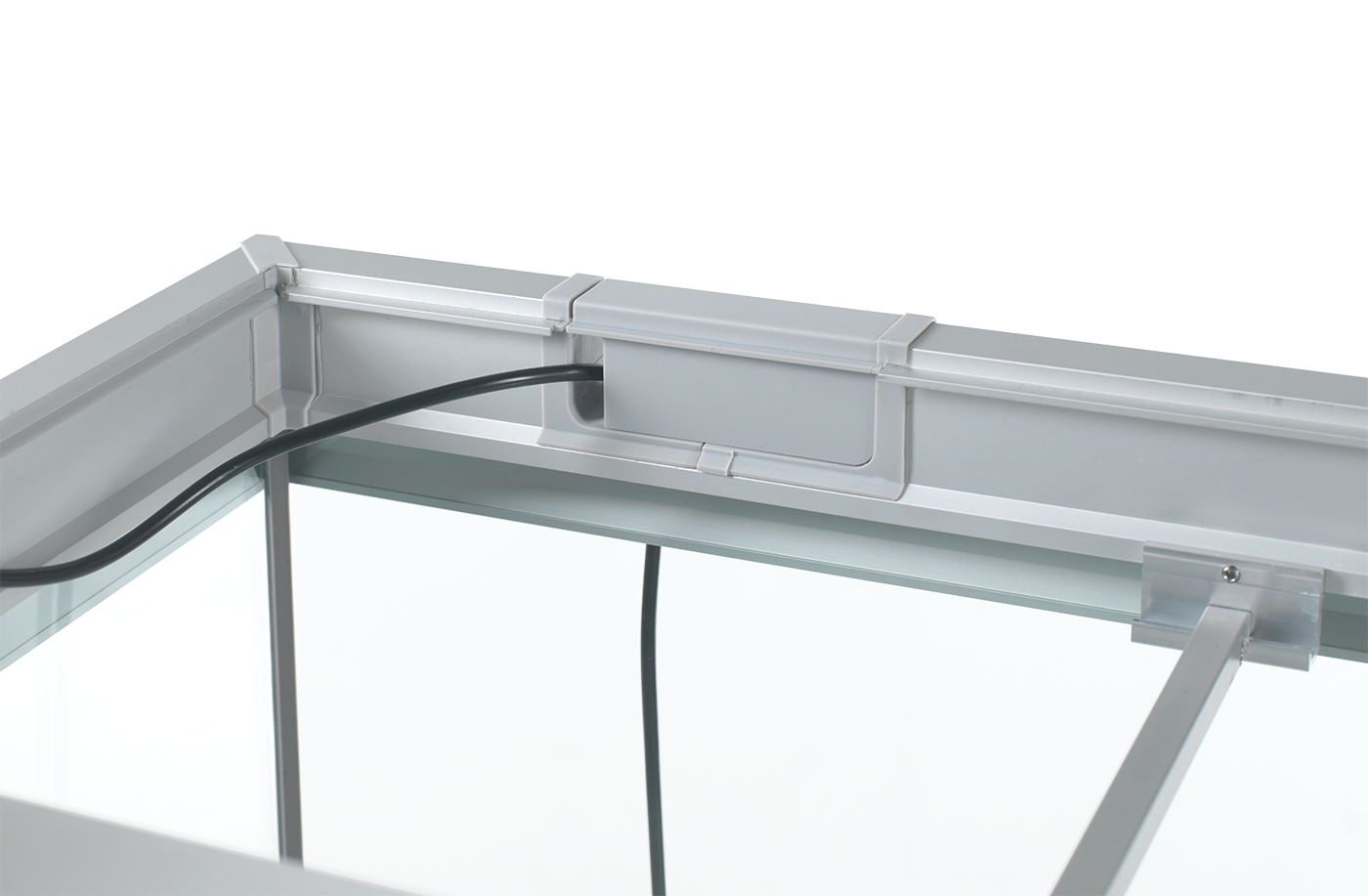 Låget på FUSION består af en solid 12 cm bred aluminiumsprofil med hvide kompositplader på begge sider. På den måde åbner du let låget både for og bag. Hverken aluminiumsprofilen eller pladerne er fastgjort til akvariet, så du nemt kan løfte det helt af, hvis det skulle være nødvendigt. Låget har hverken kanter eller sprækker, som vandet kan ligge på, hvilket gør det let at holde rent og pænt. Åbn låget og skub dine LUMAX LED-lamper bagud, så de ikke er i vejen for dig mens du arbejder nede i akvariet. På den måde har du et perfekt arbejdslys der lyser lige ned i akvariet - lige dér hvor du har brug for det!