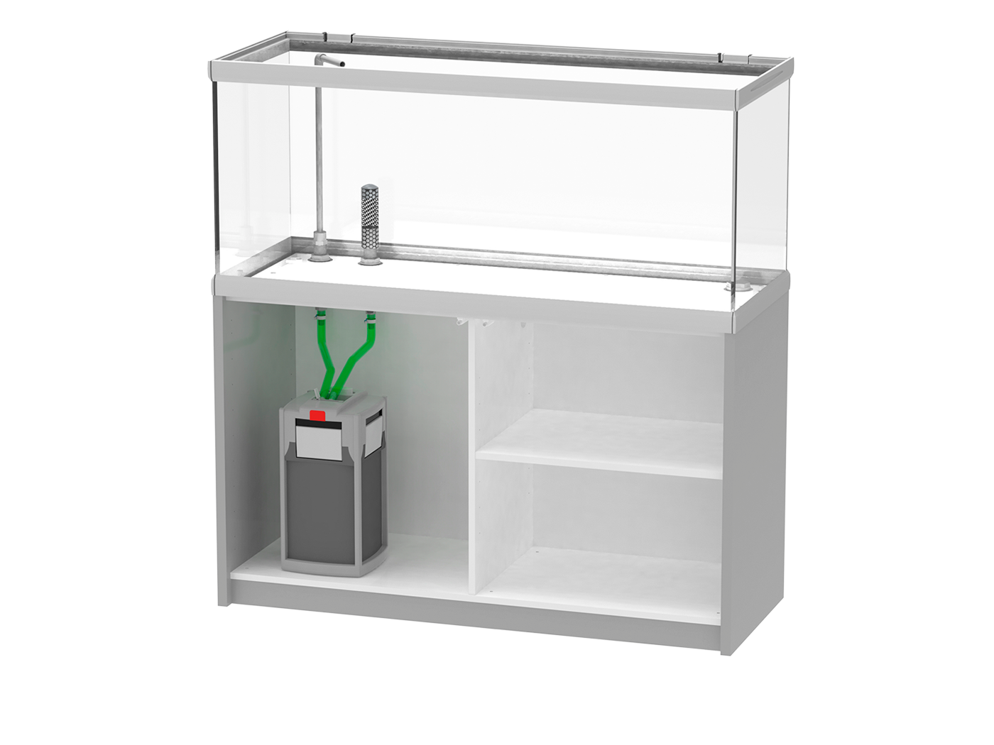 Spandfilteret med 2 slanger - én ind og én ud, er det mest almindelige. Denne type er passende til langt de fleste akvarier. Filteret placeres i møblet under akvariet. Vi anbefaler at både indsugning og udstrømmer monteres i samme side. Udstrømmeren drejes skråt ud mod forruden, så vandet ”kører” en tur rundt i hele akvariet, inden det igen suges ud gennem indsugningskurven og bliver renset i filteret. Ved 200cm akvarier eller længere anbefaler vi at der monteres et filter i hver side - derfor er der også 4 huller i bunden af vores 900 og 1250 liter FUSION akvarier.
